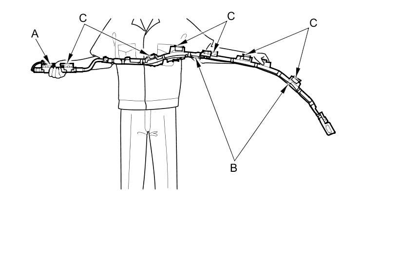 - The side curtain airbag module assembly is a long, jointed part containing an inflator (A), a flexible bag (B), and brackets (C). When removing or installing the side curtain airbag assembly, never: