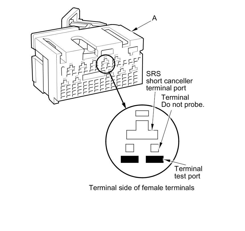- Do not insert the pin probes of the tester or a jumper wire at the terminal port or the SRS short canceller terminal port.