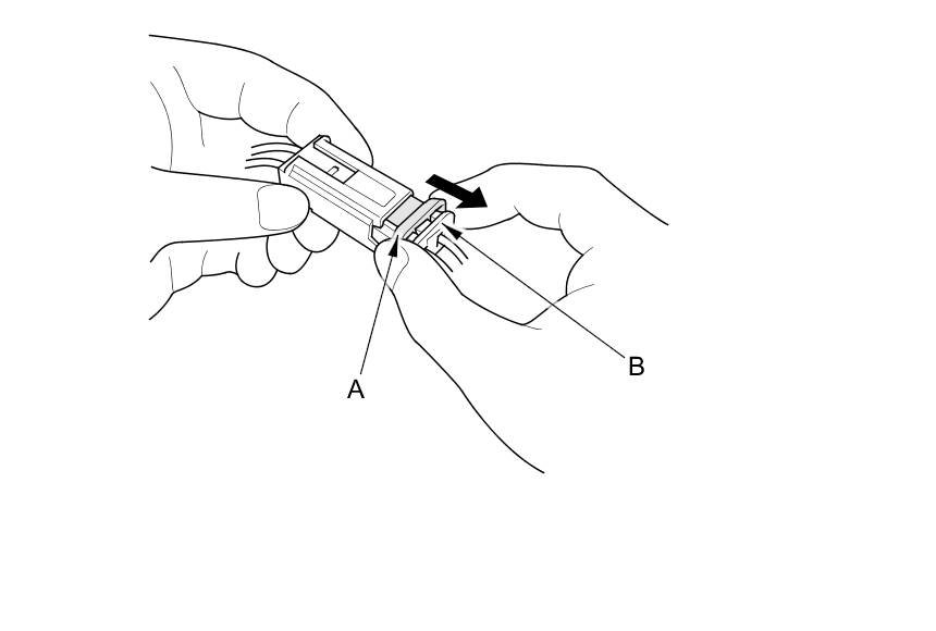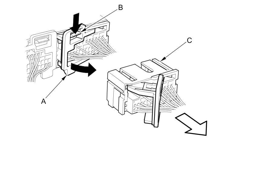 To release the lock, pull the lever (A) while pushing the lock (B) on the outside of the connector, then pull out the connector (C).