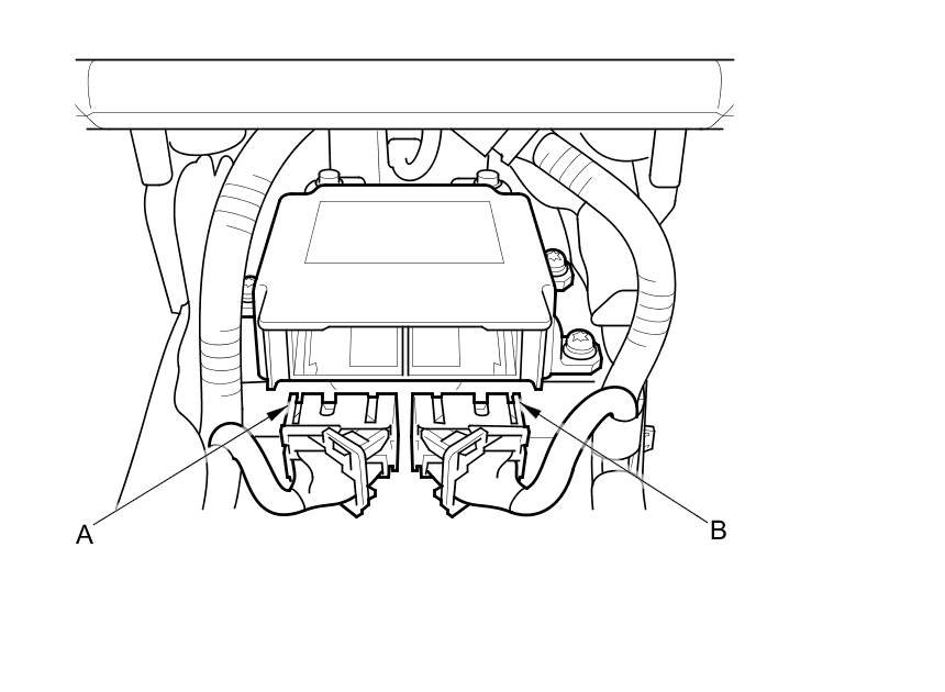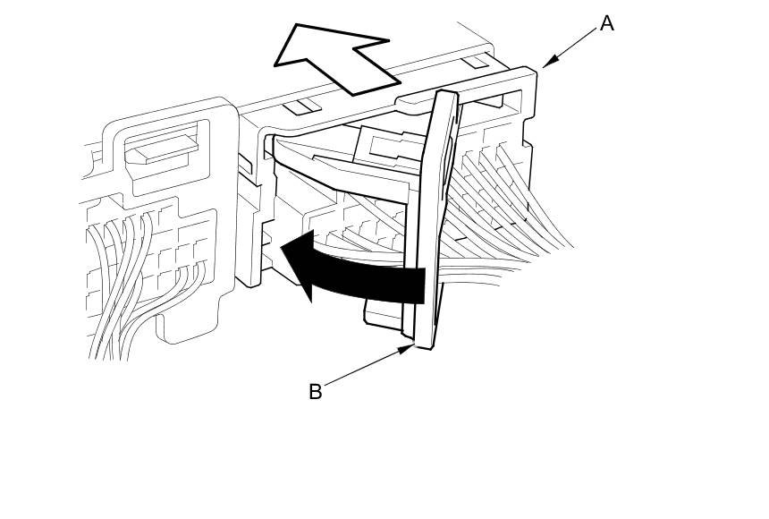 To reconnect the connector, push in on the connector (A). As the connector is pressed in, the lever (B) moves to the locked position.