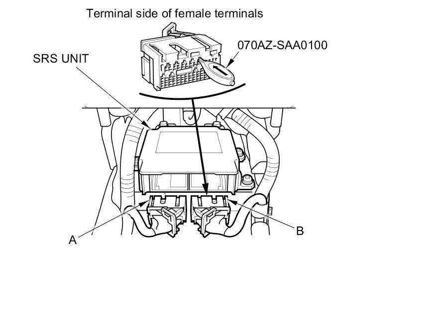 When diagnosing or troubleshooting at an SRS unit connector (A), use the terminal test port below the terminal you need to check. Gently insert the pin probes of the tester or jumper wire at the terminal test port from the terminal side.