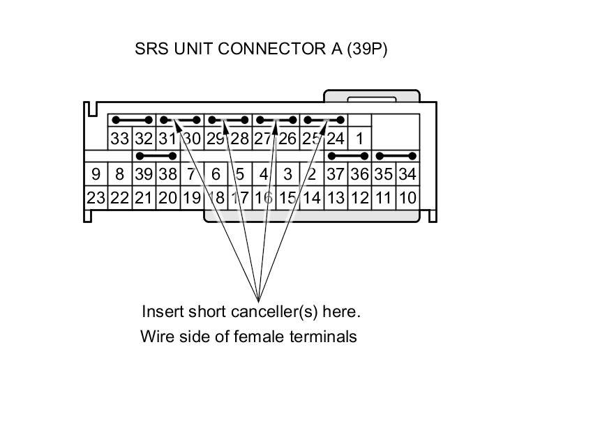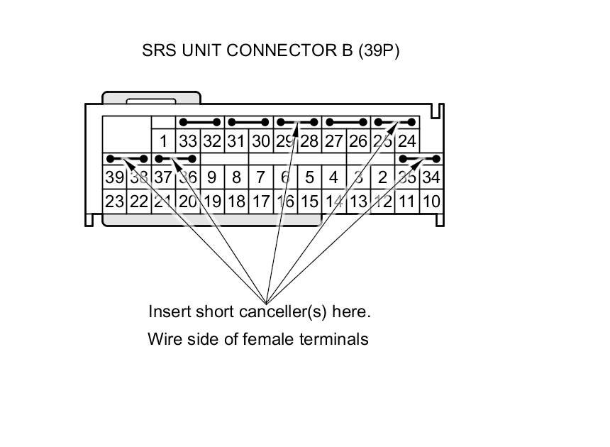 When SRS unit connector A (39P) or B (39P) is disconnected, a short circuit is automatically created in the connector to prevent accidental deployment of an airbag or tensioner. The circuit may need to be opened sometimes when diagnosing the system. Insert an SRS short canceller in the specified cavities when necessary to keep the circuit open for diagnosis.