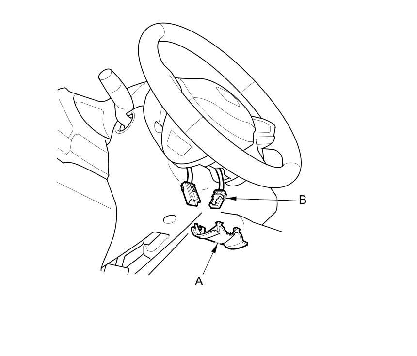 2. Remove the access panel (A) from the steering wheel, then disconnect the driver's airbag inflator 4P connector (B) on the cable reel harness.
