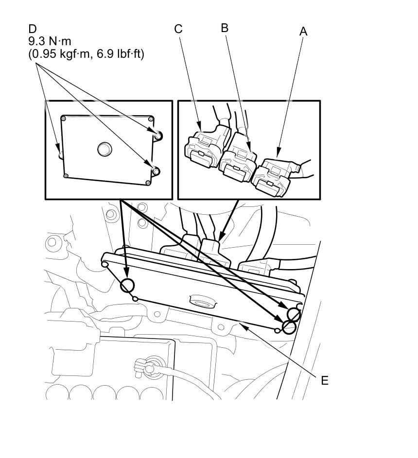14. Disconnect ECM/PCM connectors A, B, and C, then remove the ECM/PCM (E).