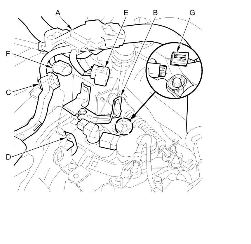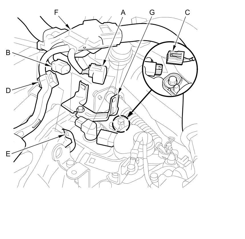 15. Connect the transmission range switch 8P connector (E), the CVT output shaft (driven pulley) speed sensor 3P connector (F), and the vehicle speed sensor 3P connector (G).