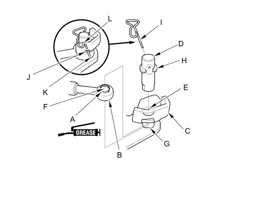 13. Insert the lock pin (I) in the direction shown through the control pin hole and out the opening (J) of the selector control lever so that the hooked end (K) of the lock pin locks into the countersunk hole (L) of the control pin.