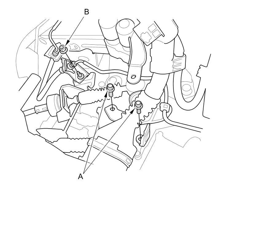 3. M/T model: Remove the clutch hose bracket bolts (A) and nut (B).