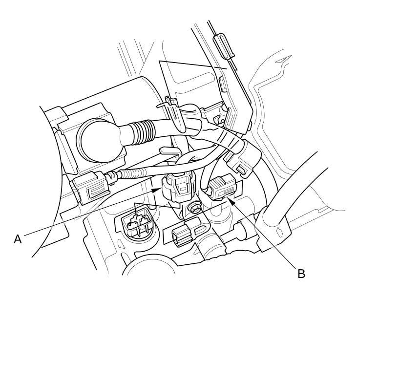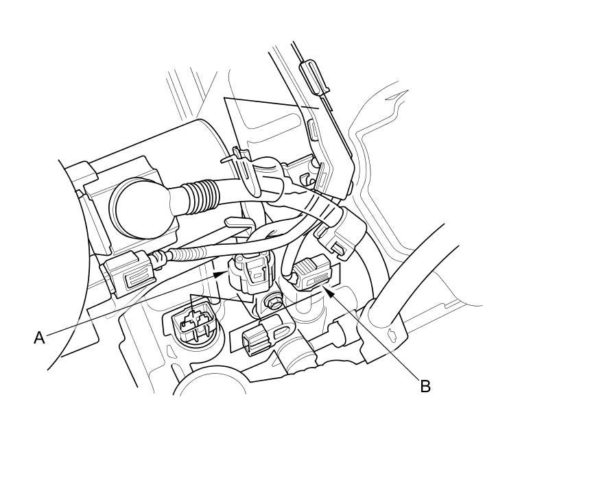 4. CVT model: Disconnect the solenoid wire harness connector (A) and the CVT input shaft (drive pulley) speed sensor connector (B).