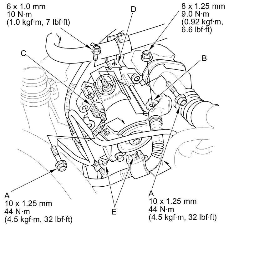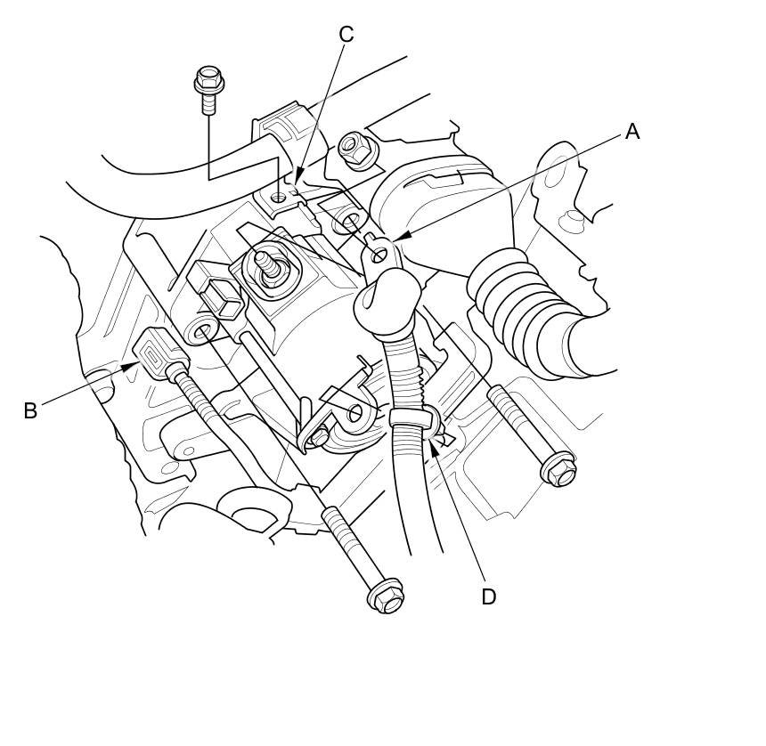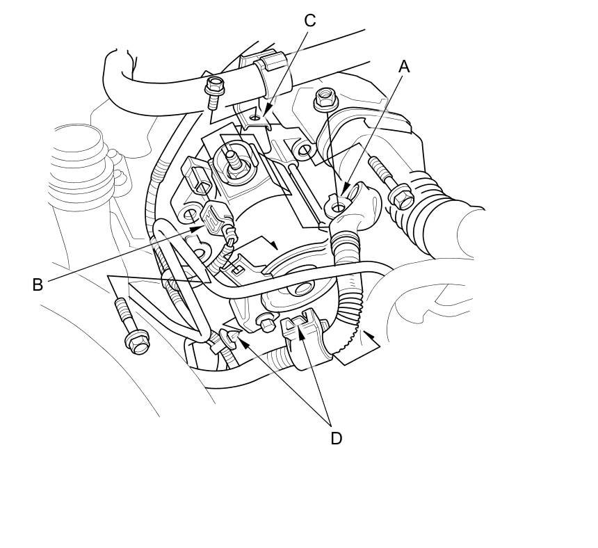 5. Disconnect the positive starter cable (A) and the harness connector (B) from the S terminal, then remove the heater hose bracket (C) and the harness clamps (D).
