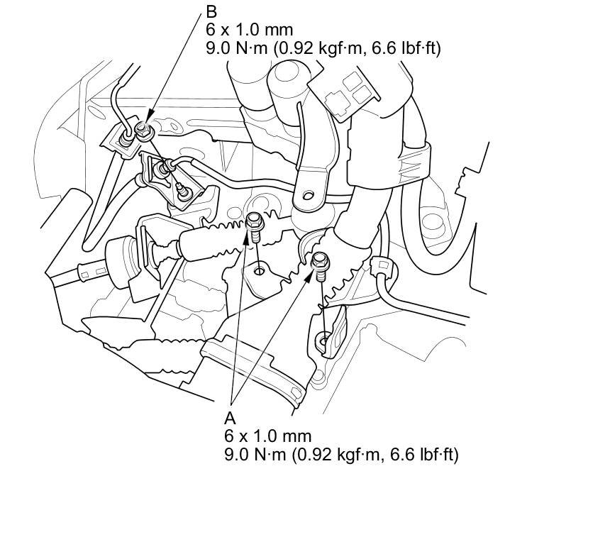 3. M/T model: Install the clutch hose bracket bolts (A) and nut (B).