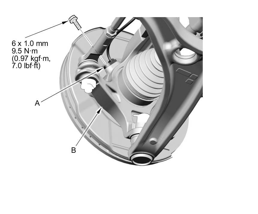 5. Remove the wheel speed sensor (A) from the knuckle (B). Do not disconnect the wheel speed sensor 2P connector.