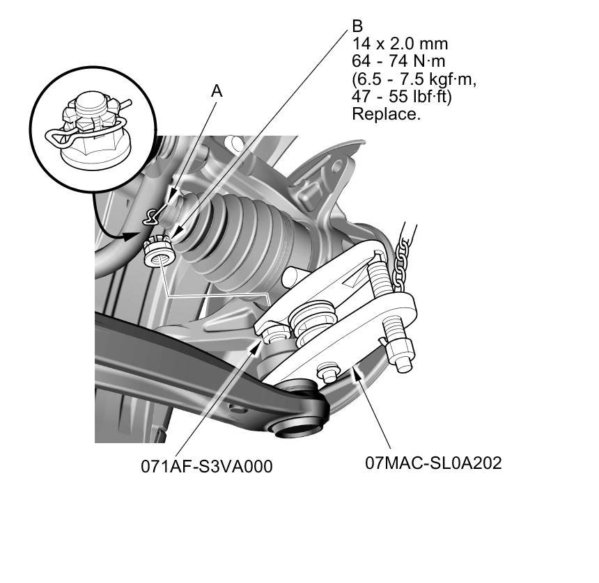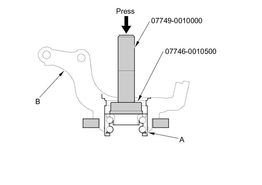 4. Press the wheel bearing (A) out of the knuckle (B) using the bearing driver attachment, the driver handle, and a press.