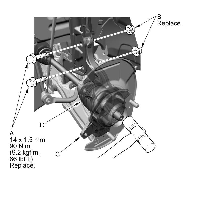 1. Separate the hub (A) from the knuckle (B) using the hub dis/assembly pin and a hydraulic press. Hold the knuckle with the attachment (C) of the hydraulic press or equivalent tool. Be careful not to damage or deform the splash guard (D). Hold onto the hub to keep it from falling when pressed clear.