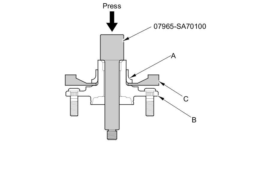 2. Press the wheel bearing inner race (A) off of the hub (B) using the hub dis/assembly pin, a commercially available bearing separator (C), and a press.