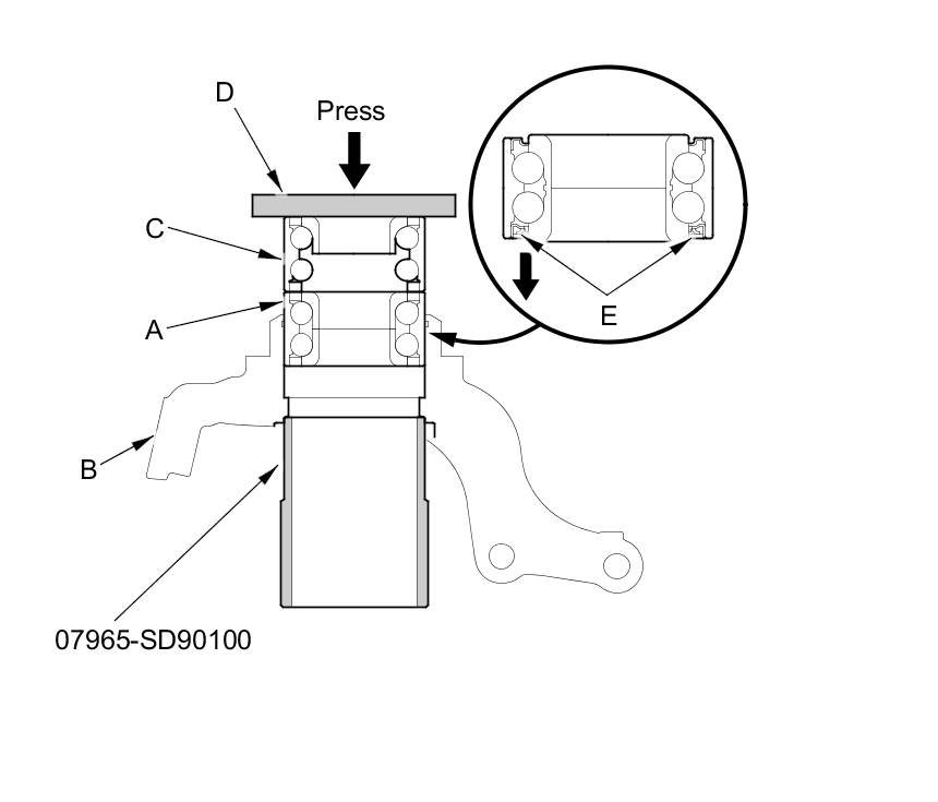 - Install the wheel bearing with the wheel speed sensor magnetic encoder (E) (brown color) toward the inside of the knuckle.
