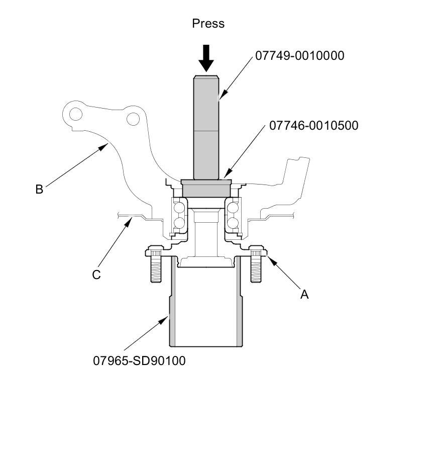 9. Install the hub (A) onto the knuckle (B) using the bearing driver attachment, the driver handle, the support base, and a hydraulic press. Be careful not to damage the splash guard (C).