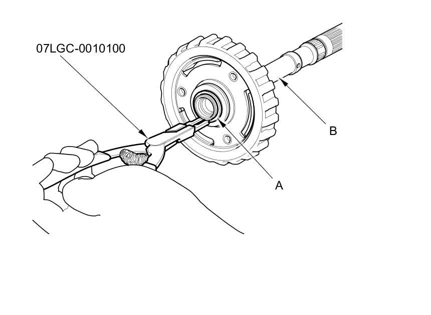 1. Expand the snap ring (A) on the input shaft (B) using snap ring pliers, and remove the snap ring from the input shaft.