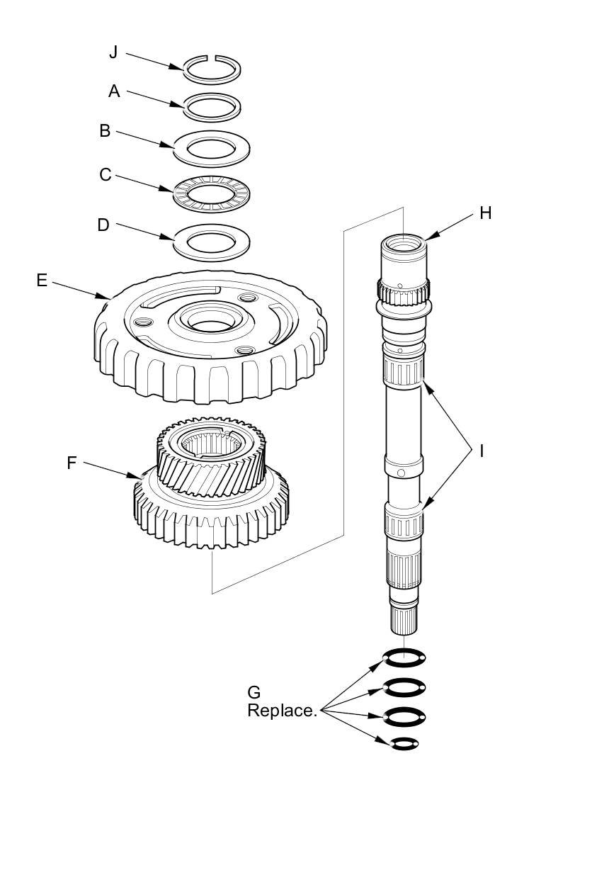 4. Install new O-rings, the sun gear, the planetary carrier, the 25 x 41.5 x 1 mm thrust shim, the thrust needle bearing, the 25 x 41.5 x 2.5 mm thrust shim, the 25 x 31 mm thrust shim, and the snap ring (J) to the input shaft.