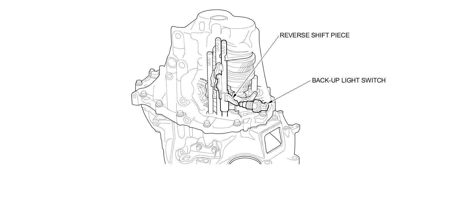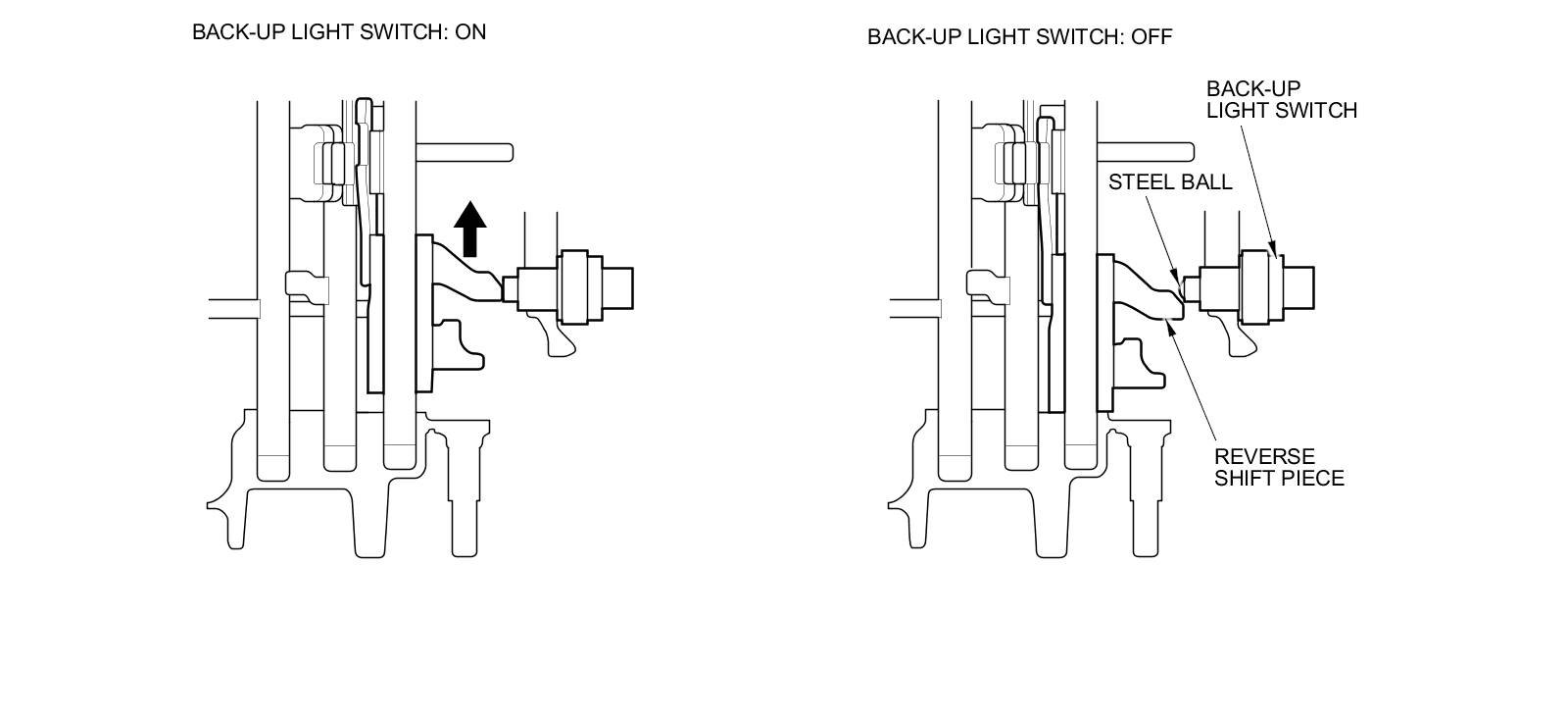 When the transmission is in reverse, the reverse shift piece pushes the steel ball of the back-up light switch and turns the switch ON. The vehicle has an Auto Idle Stop system, and the signal from the back-up light switch is one of the conditions for auto idle stop.