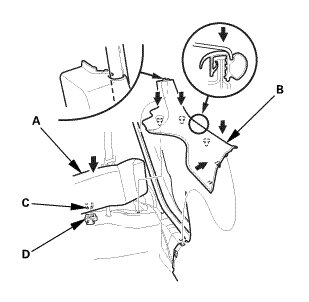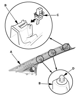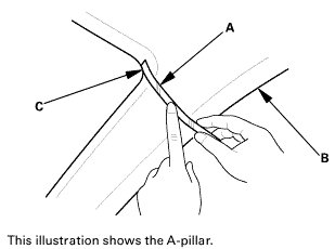 * After checking and adjusting the overlap between the headliner and the A-pillar trim, replace the upper clip (C) with a new one.