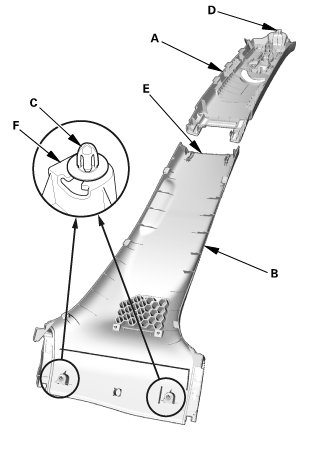 1. If the side curtain airbag has deployed, replace the B-pillar upper trim (A), the B-pillar lower trim (B), and all clips (C) on the trim with new parts.