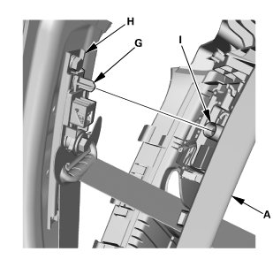 * Make sure the pin (G) on the front seat belt shoulder anchor adjuster (H) and the hole (I) on the back of the slider are engaged when installing the B-pillar upper trim.