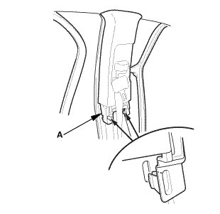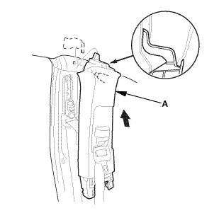 1. If the side curtain airbag has deployed, replace the A-pillar trim (A) and all clips on the trim with new parts.