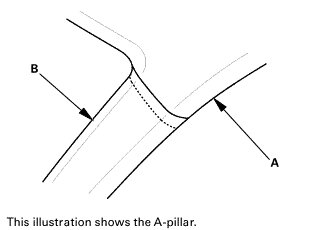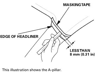 To prevent the side curtain airbag from deploying and damaging the pillar trim (A-pillar trim, B-pillar trim, C-pillar trim, quarter pillar trim), the overlap between the headliner and pillar trim must be less than 8 mm (0.31 in). To check the overlap, do this: