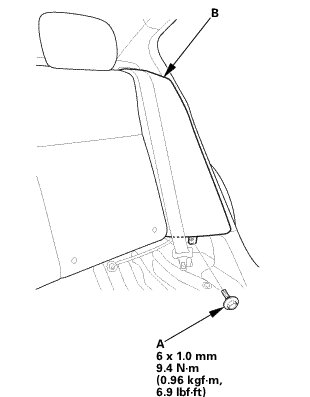 3. Install the bolt (A) securing the rear seat side bolster (B).