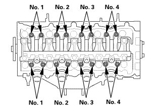 8. Torque the cylinder head bolts in sequence to 40 Nm (4.1 kgfm, 30 lbfft). Use a beam-type torque wrench. When using a preset click-type torque wrench, be sure to tighten slowly and do not overtighten. If a bolt makes any noise while you are torquing it, loosen the bolt and retighten it from the first step.