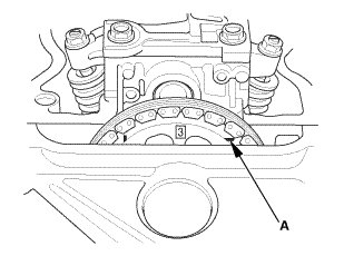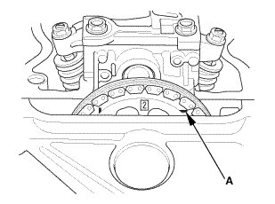 10. Rotate the crankshaft clockwise. Align the No. 2 piston TDC groove (A) on the camshaft sprocket with the top edge of the head.