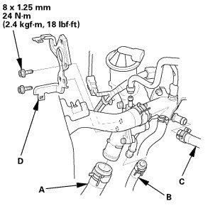 1. Connect the upper radiator hose (A), the heater hose (B), and the water bypass hose (C).