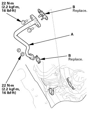 1. Install the EGR pipe (A) with new gaskets (B).