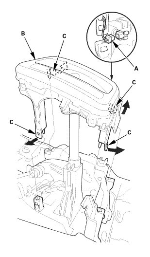 2. Remove the A/T gear position indicator panel assembly (B) by expanding the four lock tabs (C).