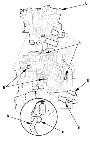 3. Remove the shift lock unit (E) while releasing the four lock tabs (F).