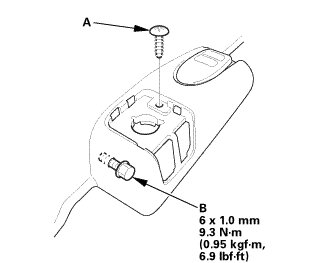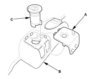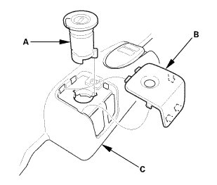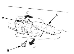 2. Remove the opener mounting front bolt (B), then remove the trunk lid opener/fuel fill door opener (C).
