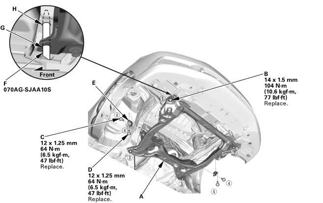 3. Insert the subframe alignment pin (F) through the positioning hole (G) on the right front subframe, and into the positioning hole (H) on the body, then loosely tighten the subframe right front mounting bolt.