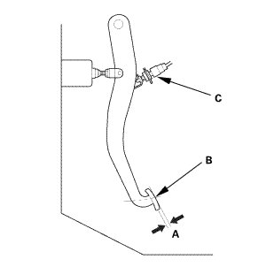 2. Inspect the free play (A) at the brake pedal pad (B) by pushing the brake pedal by hand. If the brake pedal free play is out of specification, adjust the brake pedal position switch (C). If the brake pedal free play is insufficient, it may result in brake drag.