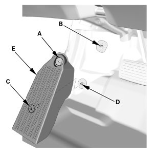 1. Pull back the carpet, and find the cutout (A) in the insulation. Measure the pedal height (B) from the left side middle of the pedal pad (C) to the floor (D) without the insulation.