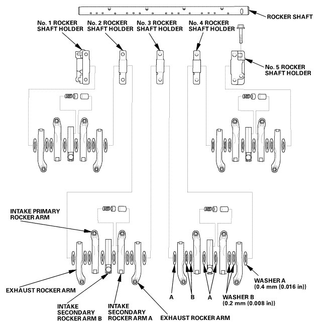 4. Repeat for all rocker arms and both shafts. If the clearance is beyond the service limit, replace the rocker shaft and all out of service limit rocker arms. If any intake secondary rocker arm needs replacement, replace the rocker arms (primary and secondary) as an assembly.