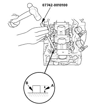 3. Install the guide from the camshaft side of the head; use the valve guide driver to drive the guide into the specified installed height (A) of the guide (B). If you have all eight guides to do, you may have to reheat the head.