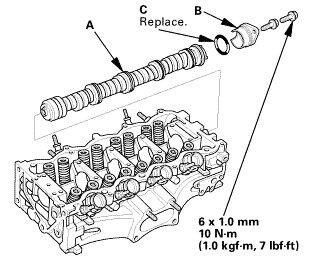 2. Install the camshaft thrust cover (B) with a new O-ring (C).