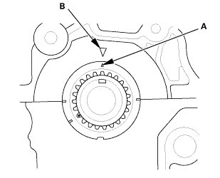 1. Set the crankshaft to top dead center (TDC). Align the TDC mark (A) on the crankshaft sprocket with the pointer (B) on the engine block.