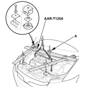 4. Tighten the wing nut (A) by hand, and lift and support the engine/transmission.