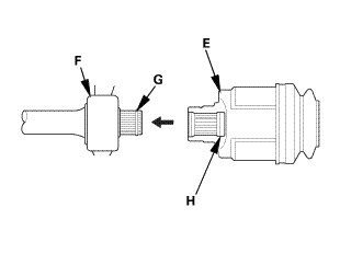 10. Right driveshaft (with intermediate shaft): Insert the inboard end (E) of the driveshaft into the intermediate shaft (F) until the set ring (G) locks in the groove (H).