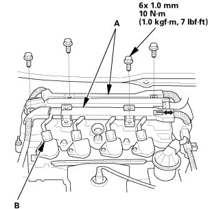 5. Remove the old liquid gasket from the top edge matting surfaces of the oil pump (A) and cylinder head (B).