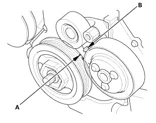 1. Hold the pulley with the holder handle (A) and the crankshaft pulley holder (B).