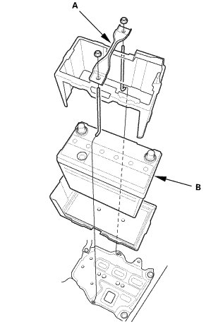 3. Disconnect the positive cable (B) from the battery.