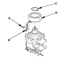 4. Remove the field coil (D). Be careful not to damage the field coil or the A/C compressor.