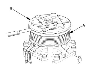 1. Remove the center nut while holding the armature plate (A) with the A/C clutch holder (B).